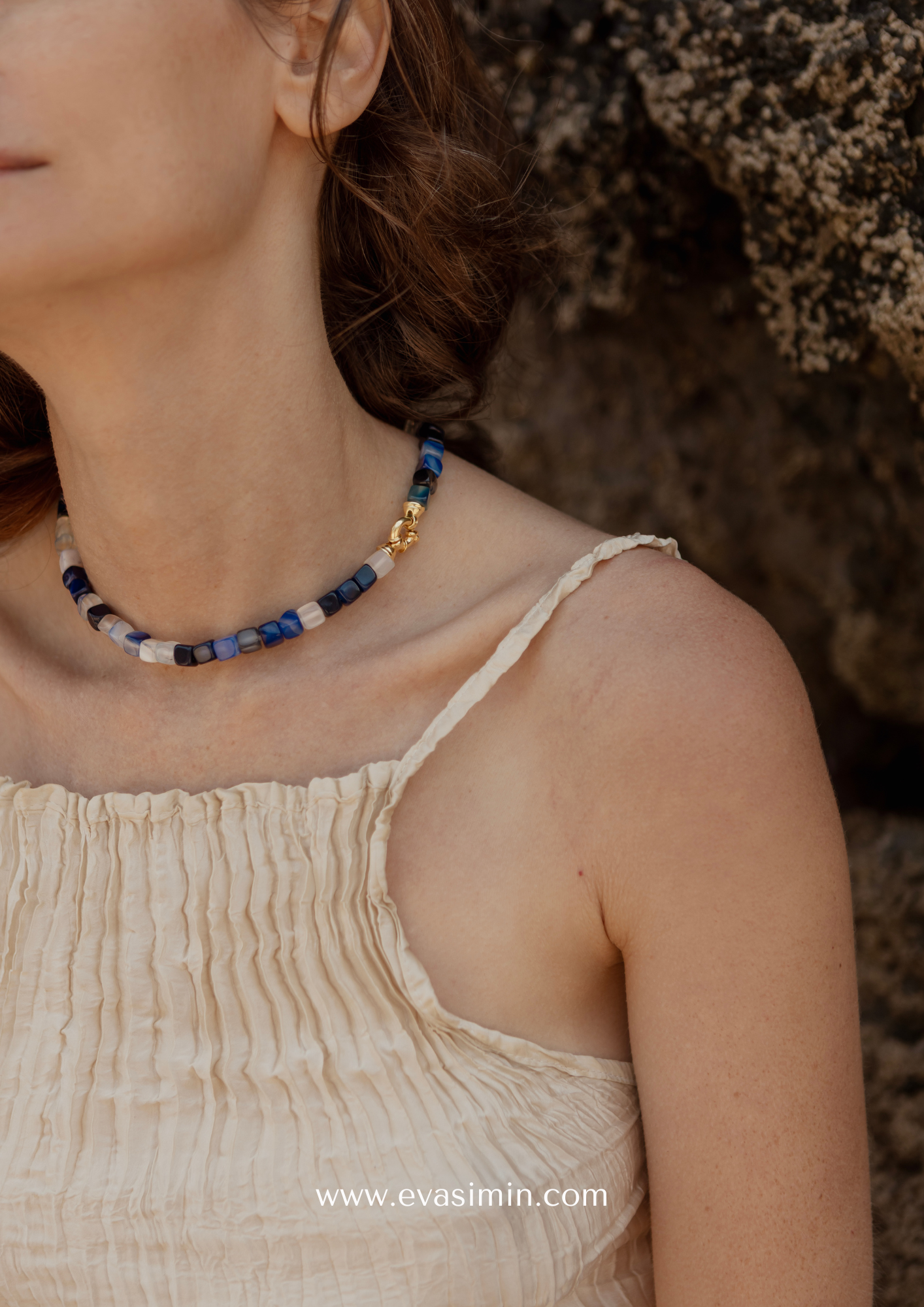 A sculptural interpretation of the Fig Fusion necklace — featuring square-cut blue quartz stones for a bolder, architectural look. The same ethically sourced gemstone from Portugal, reimagined for modern minimalists.