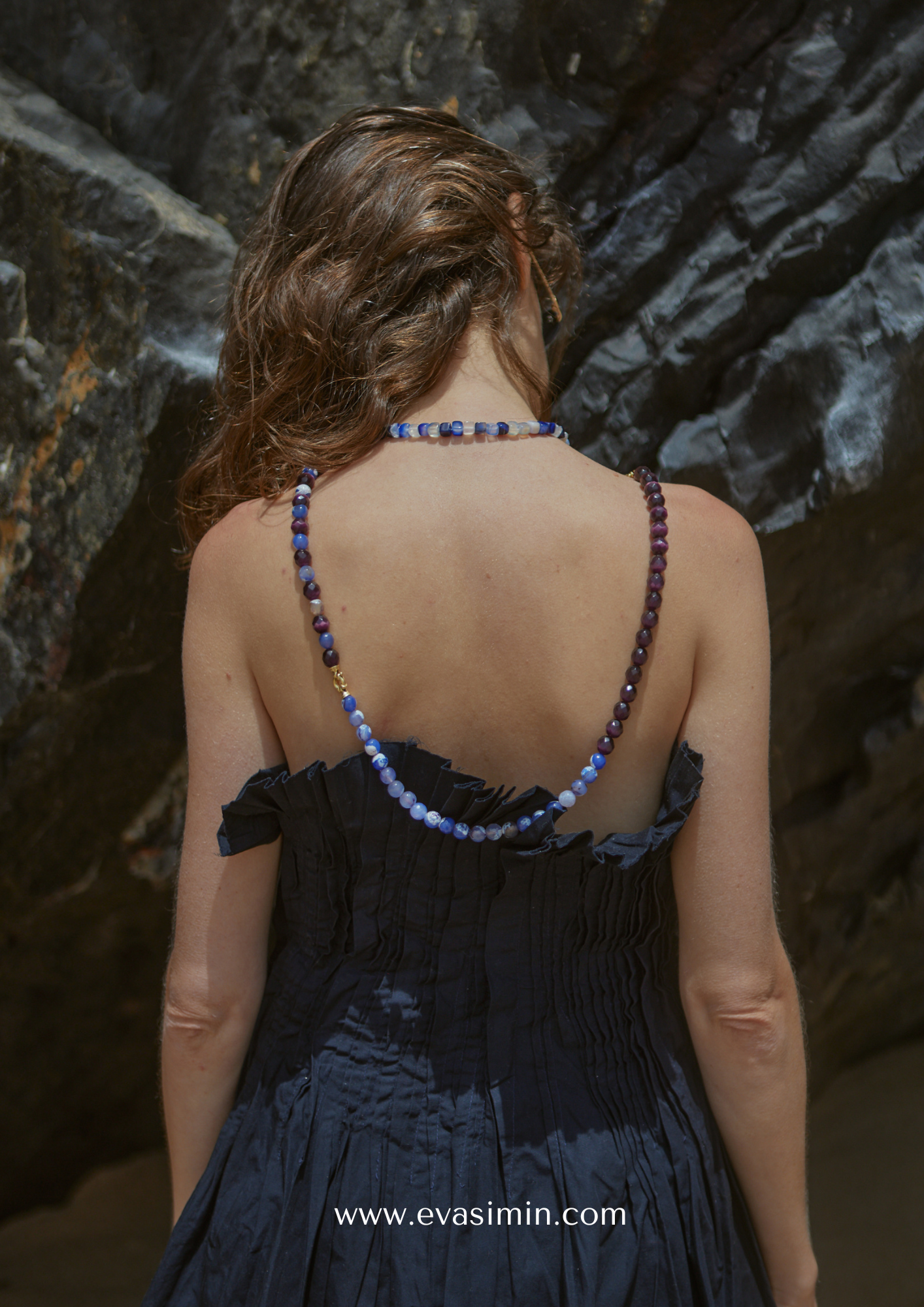Model wears the two options of our Healing Stones. Available in two versions: “Color Blogging” — one side with Purple Tiger Eye and the other with Blue Fig-Infused Quartz — or “Alternating” — where both stones are placed one by one throughout the necklace.